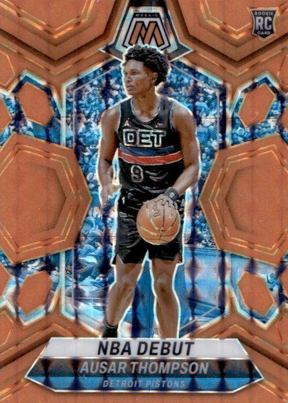 The Ausar Thompson 2023 Mosaic #262 NBA Debut - Orange Fluorescent /25 Rookie card in Raw condition has not changed in price in the last 30 days and was last sold for $45.00 .