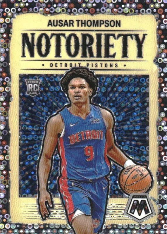 The Ausar Thompson 2023 Mosaic #1 Notoriety - Fast Break Rookie card in Raw condition has not changed in price in the last 30 days and was last sold for $4.25 .