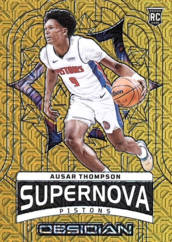 The Ausar Thompson 2023 Obsidian #1 Supernova - Electric Etch Gold Flood /10 Rookie card in Raw condition has not changed in price in the last 30 days and was last sold for $90.00 .