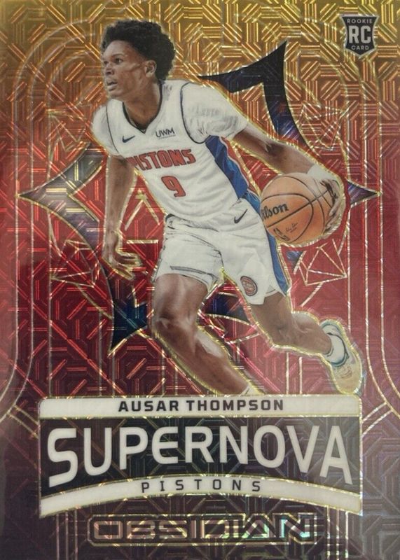 The Ausar Thompson 2023 Obsidian #1 Supernova - Electric Etch Molten Mojo /10 Rookie card in Raw condition has not changed in price in the last 30 days and was last sold for $90.00 .