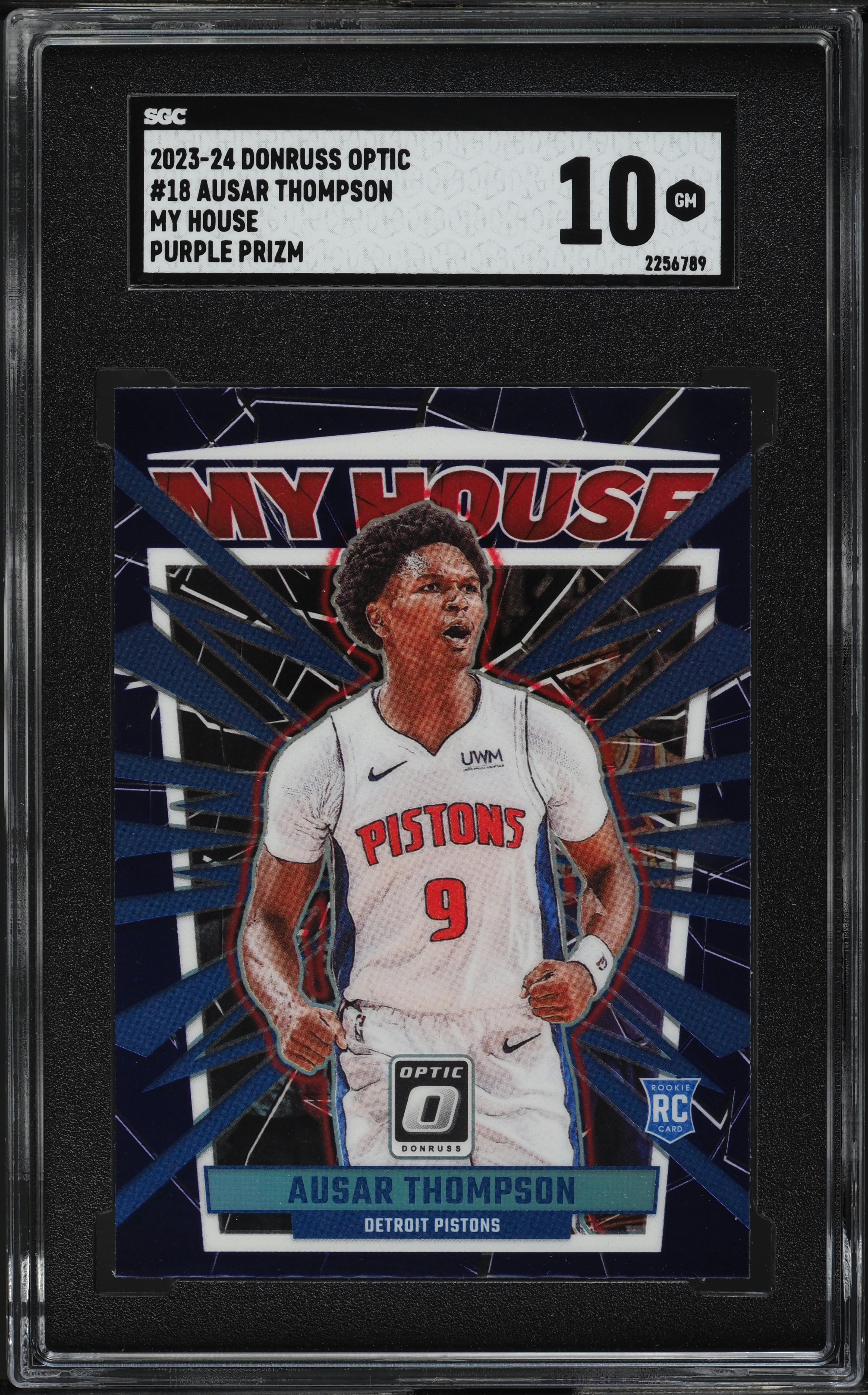 The Ausar Thompson 2023 Optic #18 My House - Purple Rookie card in Raw condition has moved down -$1.25 (-55.6%) in the last 30 days and was last sold for $1.00 .
