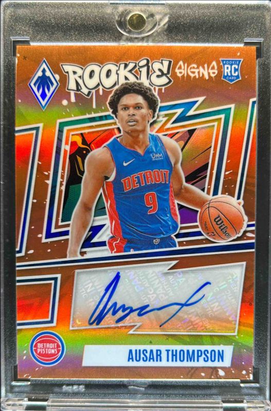 The Ausar Thompson 2023 Phoenix #RS-AUT Rookie Signs - Orange /49 card is 1 of 230 Ausar Thompson's card variations in the 2023 Phoenix set being tracked by Sports Card Investor, including Base, Blue Ice, Color Burst, Dream Weaver, and Hieroglyphs.