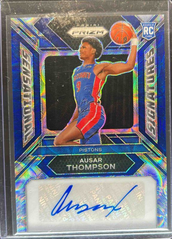 The Ausar Thompson 2023 Prizm #SS-AT Sensational Signatures - Choice Blue Rookie card is 1 of 117 Ausar Thompson's card variations in the 2023 Prizm set being tracked by Sports Card Investor, including #178 Base, #178b Base, #178 Blue Wave, #178 Choice Blue Yellow Green, and #178 Fast Break.