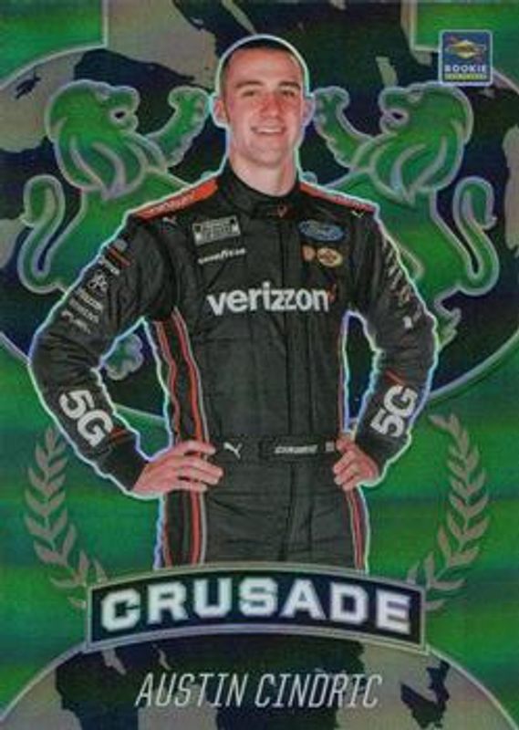 The Austin Cindric 2021 Chronicles NASCAR #16 Crusade - Green Rookie card is 1 of 83 Austin Cindric's card variations in the 2021 Chronicles NASCAR set being tracked by Sports Card Investor, including Base, Blue /199, Red /99, Purple /25, and Gold /10.