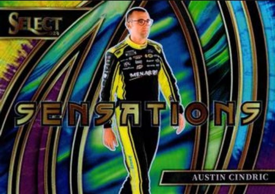 The Austin Cindric 2024 Select NASCAR #1 Sensations Tie-Dye /25 card is 1 of 67 Austin Cindric's card variations in the 2024 Select NASCAR set being tracked by Sports Card Investor, including #226 Base, #126 Base, #26 Base, #126 Base Orange Flash, and #226 Base Orange Flash.