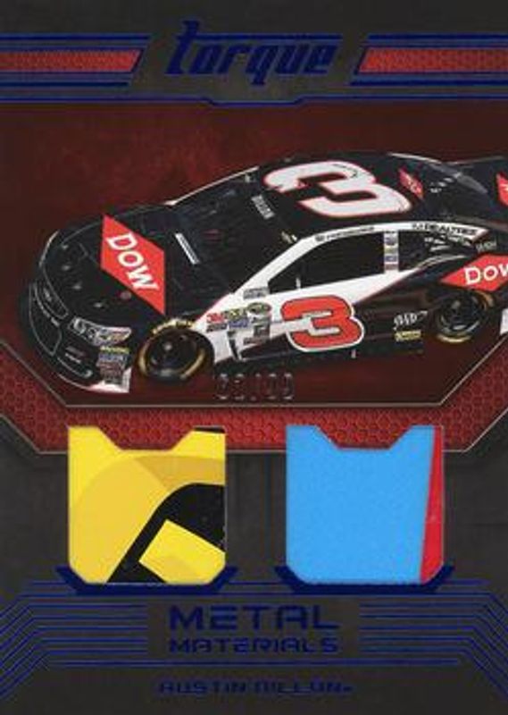 The Austin Dillon 2016 Torque NASCAR #MM-AD Metal Materials Blue /99 card is 1 of 101 Austin Dillon's card variations in the 2016 Torque NASCAR set being tracked by Sports Card Investor, including #88 Base, #12 Base, #58 Base, #12 Gold, and #58 Gold.