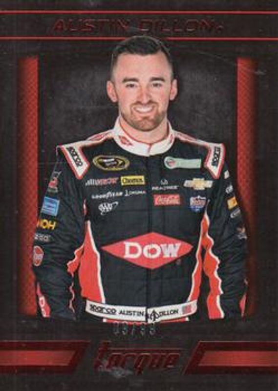 The Austin Dillon 2016 Torque NASCAR #12 Red /99 card is 1 of 101 Austin Dillon's card variations in the 2016 Torque NASCAR set being tracked by Sports Card Investor, including #88 Base, #12 Base, #58 Base, #12 Gold, and #58 Gold.