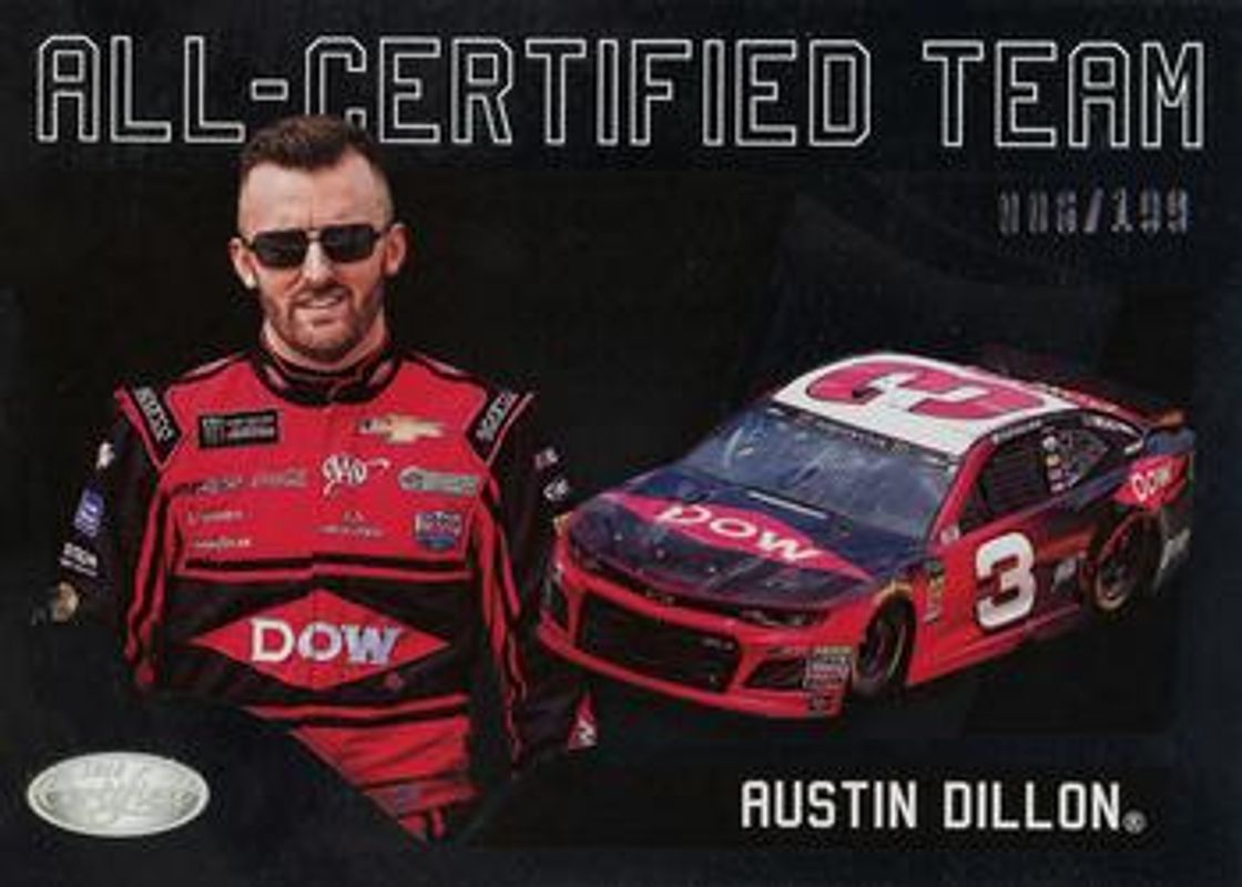 The Austin Dillon 2018 Certified NASCAR #ACT14 All Certified Team /199 card is 1 of 100 Austin Dillon's card variations in the 2018 Certified NASCAR set being tracked by Sports Card Investor, including #97 Base /149, #30 Base /149, #97 Orange /249, #30 Orange /249, and #30 Mirror Gold /25.