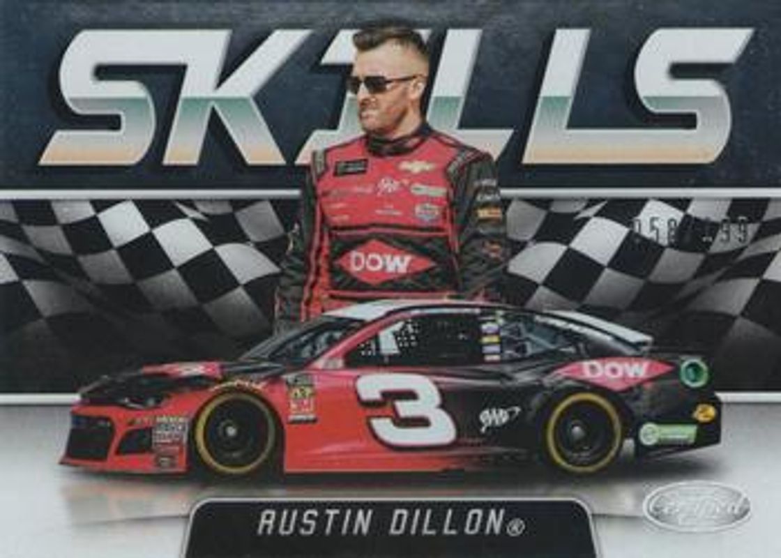 The Austin Dillon 2018 Certified NASCAR #S2 Skills /199 card is 1 of 100 Austin Dillon's card variations in the 2018 Certified NASCAR set being tracked by Sports Card Investor, including #97 Base /149, #30 Base /149, #97 Orange /249, #30 Orange /249, and #30 Mirror Gold /25.