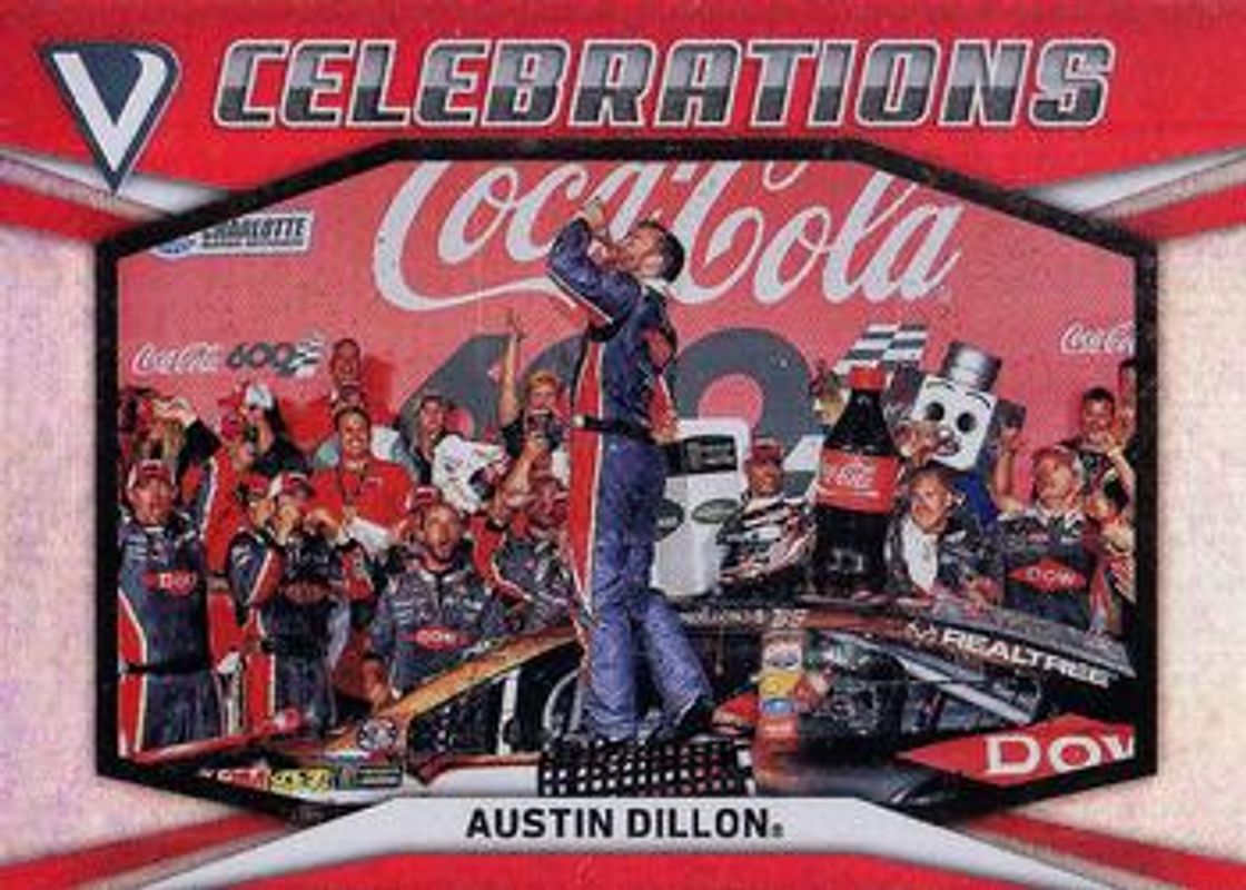 The Austin Dillon 2018 Victory Lane NASCAR #C14 Celebrations card is 1 of 49 Austin Dillon's card variations in the 2018 Victory Lane NASCAR set being tracked by Sports Card Investor, including Base, Silver, Gold /99, Red /49, and Blue /25.