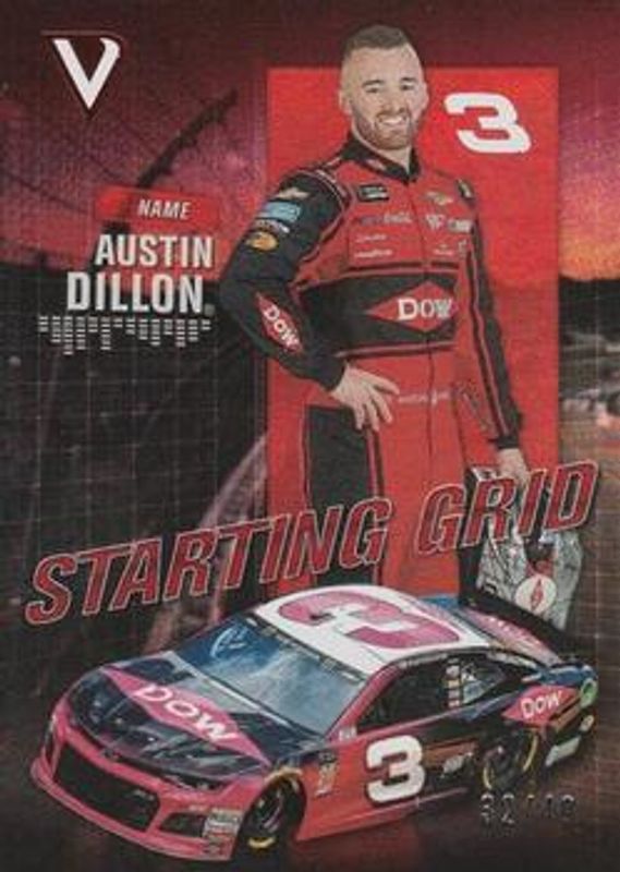 The Austin Dillon 2018 Victory Lane NASCAR #S3 Starting Grid Red /49 card is 1 of 49 Austin Dillon's card variations in the 2018 Victory Lane NASCAR set being tracked by Sports Card Investor, including Base, Silver, Gold /99, Red /49, and Blue /25.