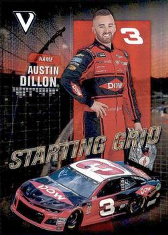 The Austin Dillon 2018 Victory Lane NASCAR #S3 Starting Grid card is 1 of 49 Austin Dillon's card variations in the 2018 Victory Lane NASCAR set being tracked by Sports Card Investor, including Base, Silver, Gold /99, Red /49, and Blue /25.