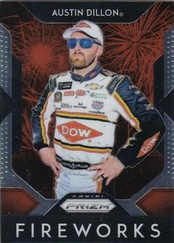 The Austin Dillon 2019 Prizm NASCAR #F-1 Fireworks card is 1 of 62 Austin Dillon's card variations in the 2019 Prizm NASCAR set being tracked by Sports Card Investor, including #3a Base, #3b Base, #78 Base, #3a Camo, and #3b Camo.