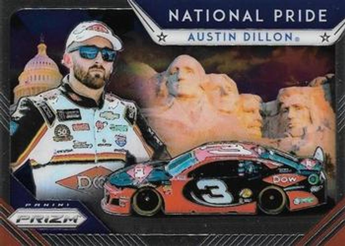 The Austin Dillon 2019 Prizm NASCAR #NP-15 National Pride card is 1 of 62 Austin Dillon's card variations in the 2019 Prizm NASCAR set being tracked by Sports Card Investor, including #3a Base, #3b Base, #78 Base, #3a Camo, and #3b Camo.