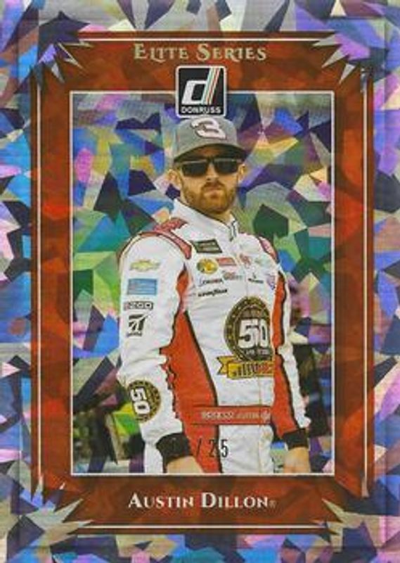 The Austin Dillon 2020 Donruss NASCAR #E8 Elite Series Cracked Ice /25 card is 1 of 130 Austin Dillon's card variations in the 2020 Donruss NASCAR set being tracked by Sports Card Investor, including #111 Base, #168 Base, #191 Base, #25 Base, and #3 Base.