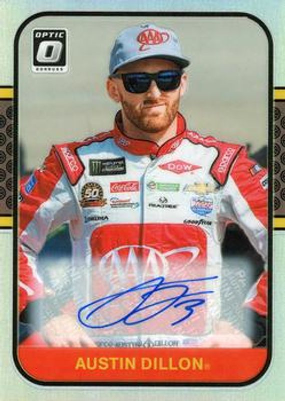 The Austin Dillon 2020 Donruss NASCAR #81 Optic Signatures Holo /25 card is 1 of 130 Austin Dillon's card variations in the 2020 Donruss NASCAR set being tracked by Sports Card Investor, including #111 Base, #168 Base, #191 Base, #25 Base, and #3 Base.