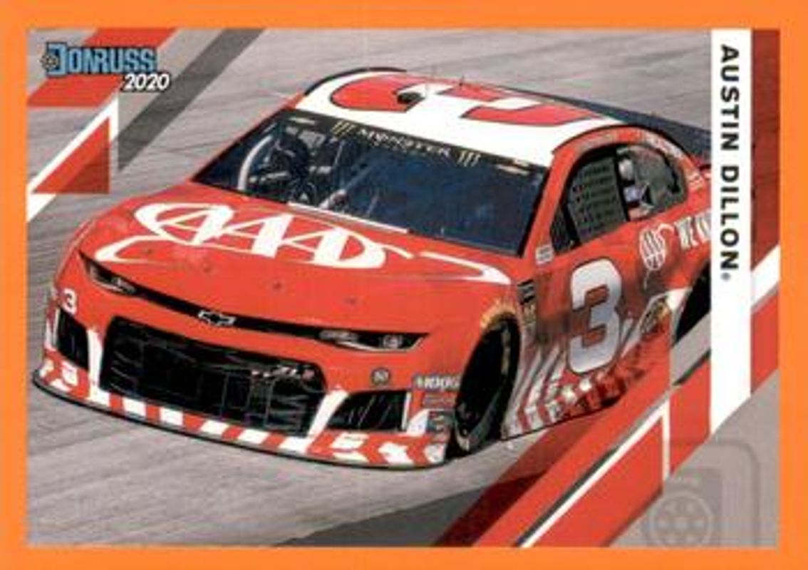 The Austin Dillon 2020 Donruss NASCAR #111 Orange card is 1 of 130 Austin Dillon's card variations in the 2020 Donruss NASCAR set being tracked by Sports Card Investor, including #111 Base, #168 Base, #191 Base, #25 Base, and #3 Base.