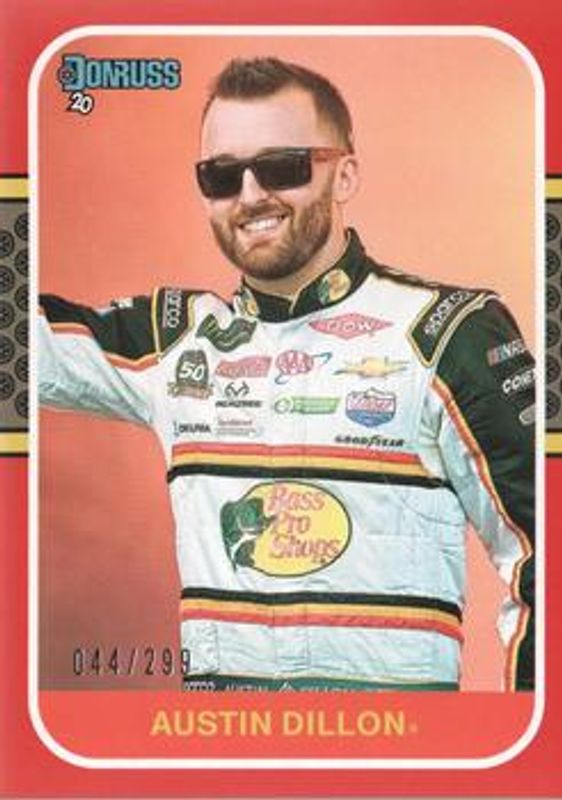 The Austin Dillon 2020 Donruss NASCAR #168 Red /299 card is 1 of 130 Austin Dillon's card variations in the 2020 Donruss NASCAR set being tracked by Sports Card Investor, including #111 Base, #168 Base, #191 Base, #25 Base, and #3 Base.