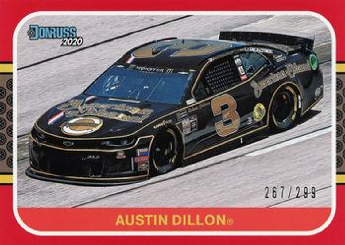 The Austin Dillon 2020 Donruss NASCAR #191 Red /299 card is 1 of 130 Austin Dillon's card variations in the 2020 Donruss NASCAR set being tracked by Sports Card Investor, including #111 Base, #168 Base, #191 Base, #25 Base, and #3 Base.