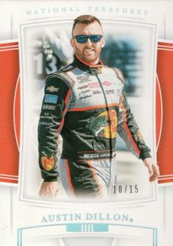 The Austin Dillon 2020 National Treasures NASCAR #25 Holo Silver /15 card is 1 of 104 Austin Dillon's card variations in the 2020 National Treasures NASCAR set being tracked by Sports Card Investor, including #57 Base /25, #25 Base /25, #91 Base /25, #57 Holo Silver /15, and #91 Holo Silver /15.