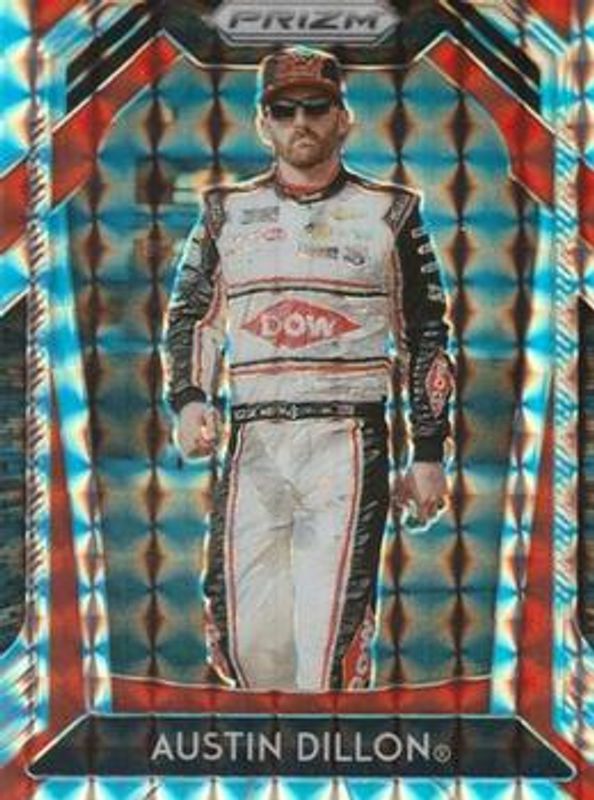 The Austin Dillon 2020 Prizm NASCAR #12 Silver Mosaic /199 card is 1 of 71 Austin Dillon's card variations in the 2020 Prizm NASCAR set being tracked by Sports Card Investor, including #12 Base, #68 Base, #68 Blue, #12 Blue, and #12 Blue & Carolina Blue Hyper.