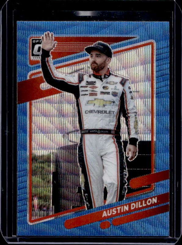 The Austin Dillon 2022 Donruss NASCAR #17 Optic Carolina Blue Wave card is 1 of 95 Austin Dillon's card variations in the 2022 Donruss NASCAR set being tracked by Sports Card Investor, including #141 Base, #24 Base, #59 Base, #141 Carolina Blue, and #24 Carolina Blue.