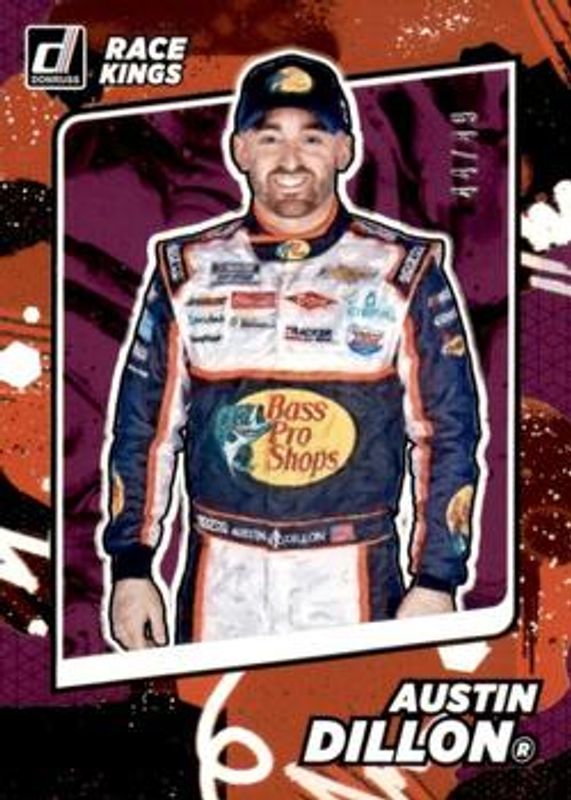 The Austin Dillon 2022 Donruss NASCAR #24 Purple /49 card is 1 of 95 Austin Dillon's card variations in the 2022 Donruss NASCAR set being tracked by Sports Card Investor, including #141 Base, #24 Base, #59 Base, #141 Carolina Blue, and #24 Carolina Blue.
