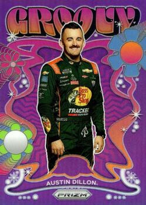 The Austin Dillon 2023 Prizm NASCAR #G4 Groovy card is 1 of 39 Austin Dillon's card variations in the 2023 Prizm NASCAR set being tracked by Sports Card Investor, including Base, Hyper Blue & Carolina Blue, Hyper Purple & Yellow, Reactive Orange, and Red.