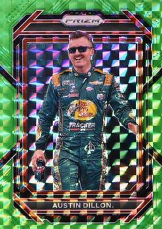 The Austin Dillon 2023 Prizm NASCAR #39 Reactive Green /249 card is 1 of 39 Austin Dillon's card variations in the 2023 Prizm NASCAR set being tracked by Sports Card Investor, including Base, Hyper Blue & Carolina Blue, Hyper Purple & Yellow, Reactive Orange, and Red.
