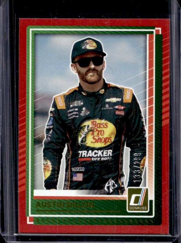 The Austin Dillon 2025 Donruss NASCAR #52 Red /299 card is 1 of 35 Austin Dillon's card variations in the 2025 Donruss NASCAR set being tracked by Sports Card Investor, including Base, Laser, Blue /199, Lime Green /199, and Carolina Blue Laser /99.