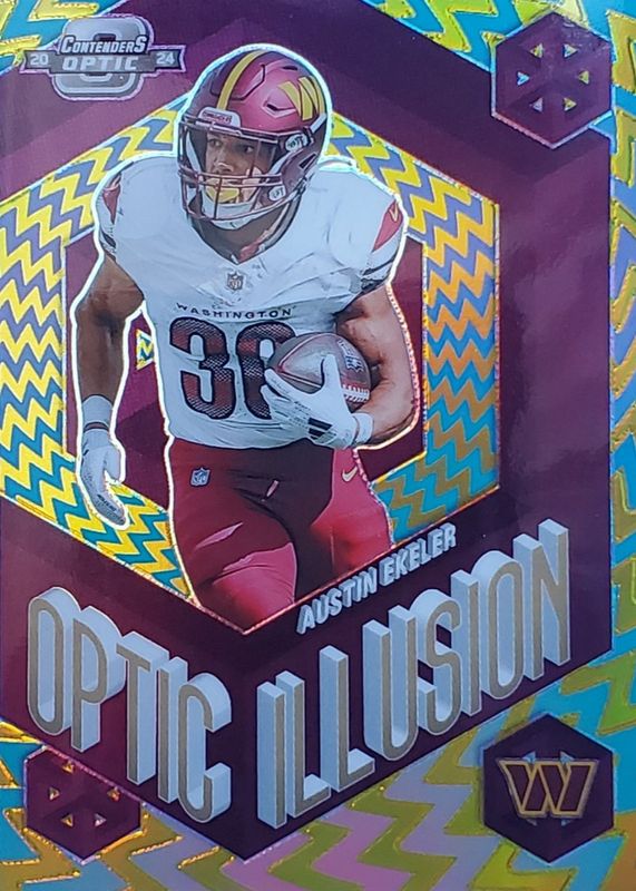 This card is 1 of 5 Austin Ekeler's card variations in the 2024 Contenders Optic set being tracked by Sports Card Investor, including Optic Illusion /(SSP), VIPs /(SSP), Optic Illusion - Black Scope /25, and Optic Illusion - Gold Vinyl /1.