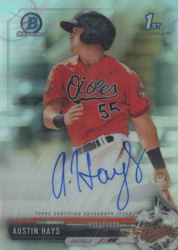 The Austin Hays 2017 Bowman Chrome #CPA-AH Prospect Auto - Refractor /499 (1st) card in Raw condition has not changed in price in the last 30 days and was last sold for $2.51 .