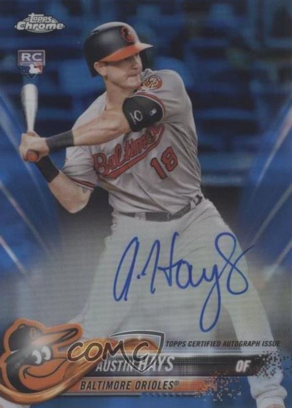 The Austin Hays 2018 Topps Chrome #RA-AH Rookie Auto - Blue Refractor /150 card in Raw condition has not changed in price in the last 30 days and was last sold for $32.44 .