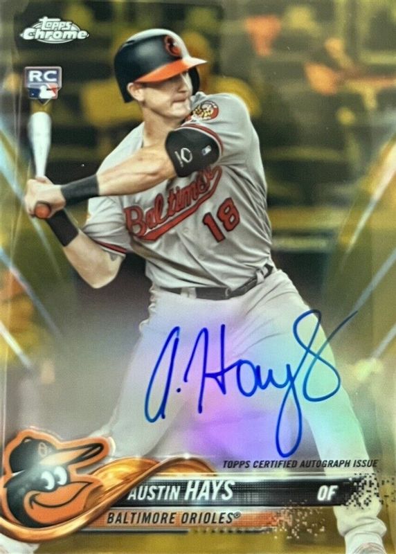 The Austin Hays 2018 Topps Chrome #RA-AH Rookie Auto - Gold Wave Refractor /50 card in Raw condition has not changed in price in the last 30 days and was last sold for $30.00 .