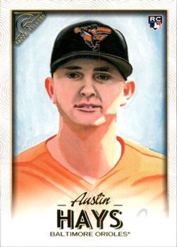 The Austin Hays 2018 Topps Gallery #99 Base Rookie card is 1 of 19 Austin Hays' card variations in the 2018 Topps Gallery set being tracked by Sports Card Investor, including Artist Proof, Wood, Private Issue /250, Green /99, and Blue /50.