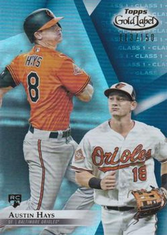 The Austin Hays 2018 Topps Gold Label #15 Class 1 - Blue /150 Rookie card is 1 of 26 Austin Hays' card variations in the 2018 Topps Gold Label set being tracked by Sports Card Investor, including Class 1, Class 2, Class 3, Class 1 - Black, and Class 2 - Black.
