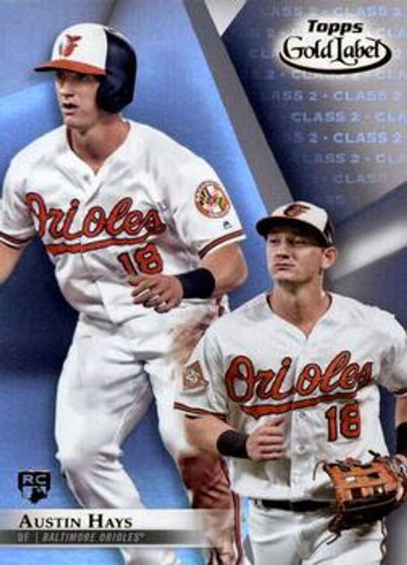 The Austin Hays 2018 Topps Gold Label #15 Class 2 Rookie card is 1 of 26 Austin Hays' card variations in the 2018 Topps Gold Label set being tracked by Sports Card Investor, including Class 1, Class 3, Class 1 - Black, Class 2 - Black, and Class 3 - Black.