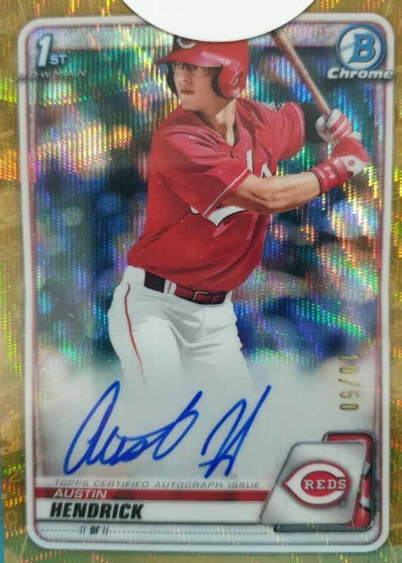 Best Prices Available For Sale of Austin Hendrick 2020 Bowman Draft #CDA-AH Chrome DP Auto - Gold Wave Refractor /50 (1st)