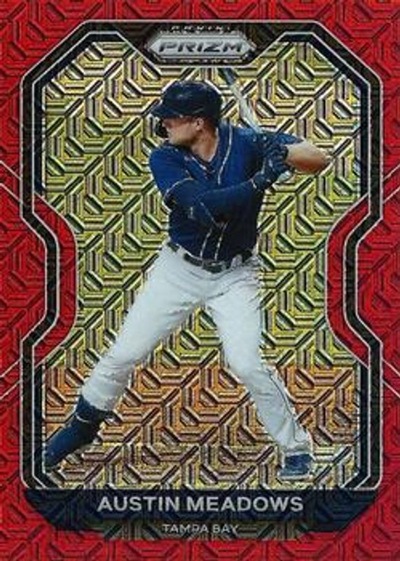 The Austin Meadows 2021 Prizm #38 Red Mojo /149 card is 1 of 43 Austin Meadows' card variations in the 2021 Prizm set being tracked by Sports Card Investor, including Base, Blue, Blue Velocity, Carolina Blue, and Cosmic Haze.