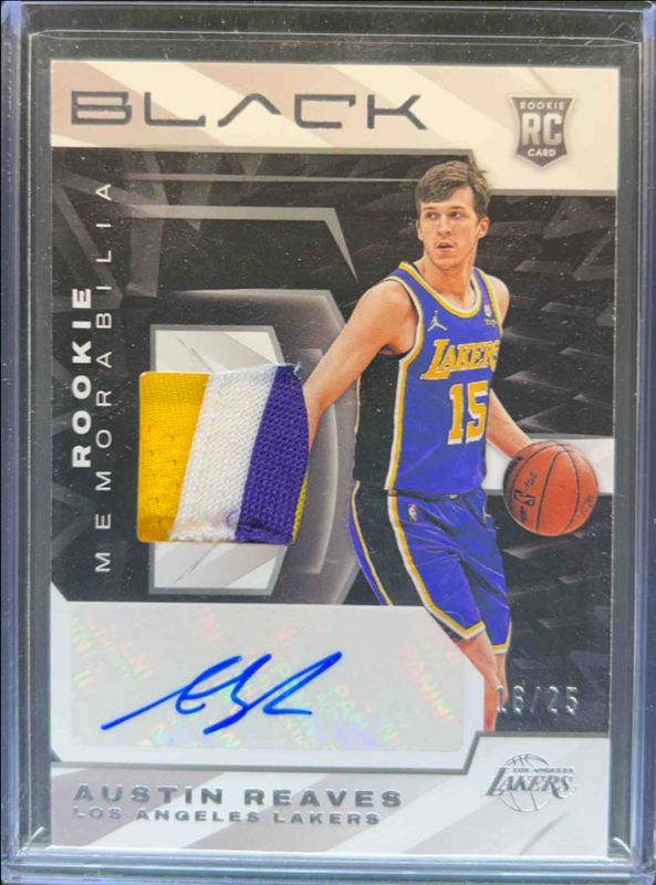 The Austin Reaves 2021 Black #RMA-AR Rookie Memorabilia Autographs - Silver /25 card is 1 of 24 Austin Reaves' card variations in the 2021 Black set being tracked by Sports Card Investor, including Base /149, Silver /75, Copper /49, Gold /25, and Holo Gold /5.