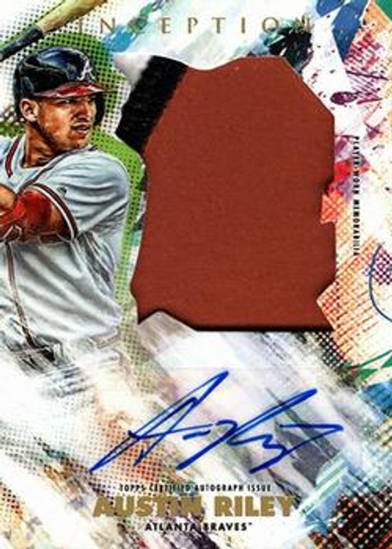 The Austin Riley 2020 Topps Inception #IAJP-AR Autographs Jumbo Patch /90 card is 1 of 27 Austin Riley's card variations in the 2020 Topps Inception set being tracked by Sports Card Investor, including Rookies & Emerging Stars Autographs /245, Autographs Patch /155, Rookies & Emerging Stars Autographs - Magenta /99, Silver Signings /99, and Autographs Patch - Magenta /75.