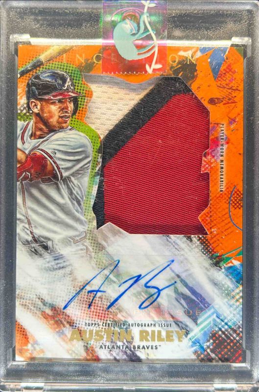 The Austin Riley 2020 Topps Inception #IAJP-AR Autographs Jumbo Patch - Orange /25 card is 1 of 27 Austin Riley's card variations in the 2020 Topps Inception set being tracked by Sports Card Investor, including Rookies & Emerging Stars Autographs /245, Autographs Patch /155, Rookies & Emerging Stars Autographs - Magenta /99, Silver Signings /99, and Autographs Jumbo Patch /90.