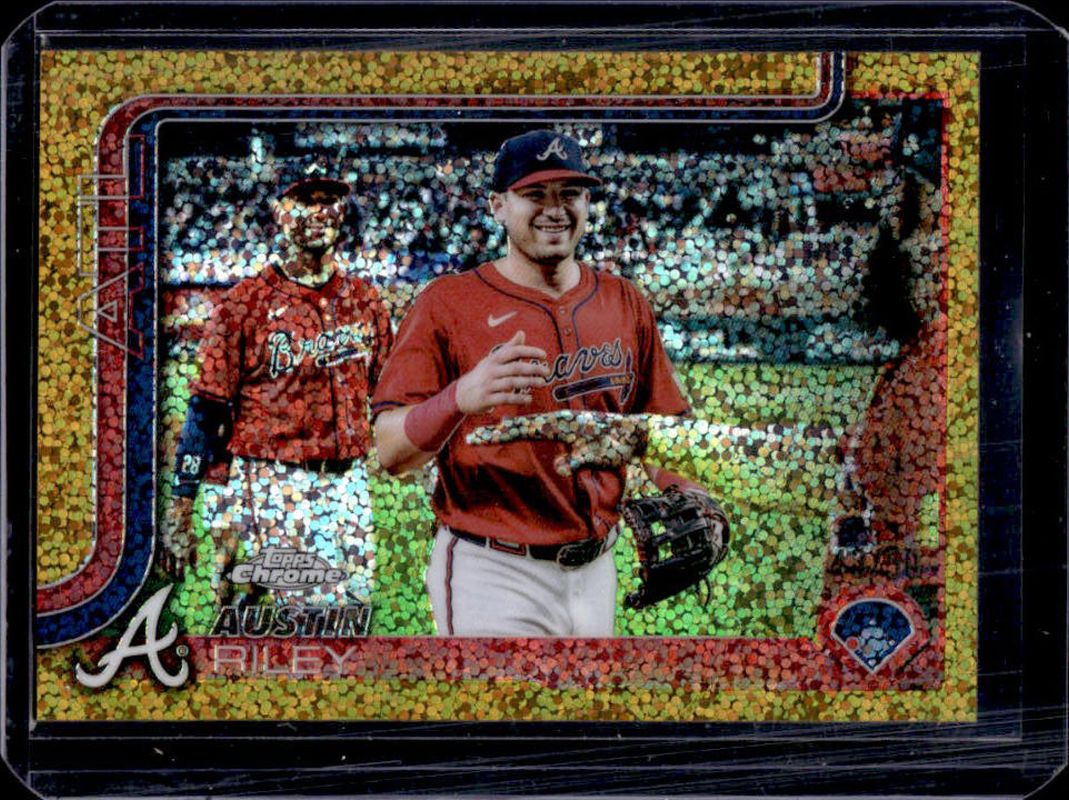 The Austin Riley 2025 Topps Chrome #206 Base Image Variation - Gold Speckle Refractor /50 card is 1 of 30 Austin Riley's card variations in the 2025 Topps Chrome set being tracked by Sports Card Investor, including Image Variation, Image Variation - Green Speckle Refractor /99, Image Variation - Gold Speckle Refractor /50, Image Variation - Orange Speckle Refractor /25, and Image Variation - Black Speckle Refractor /10.