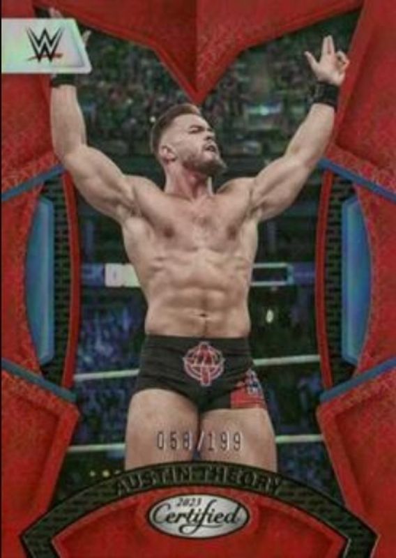 The Austin Theory 2023 Chronicles WWE #201 Red /199 card is 1 of 70 Austin Theory's card variations in the 2023 Chronicles WWE set being tracked by Sports Card Investor, including #64 Base, #105 Base, #201 Base, #289 Base, and #330 Base.