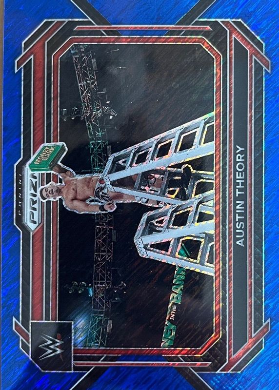 This card is 1 of 19 Austin Theory's card variations in the 2023 Prizm WWE set being tracked by Sports Card Investor, including Silver, Under Card, Red /299, Blue /199, and Premium Box Set /199.