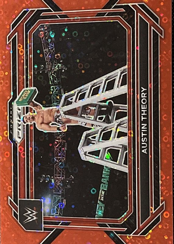 This card is 1 of 19 Austin Theory's card variations in the 2023 Prizm WWE set being tracked by Sports Card Investor, including Silver, Under Card, Red /299, Blue /199, and Premium Box Set /199.