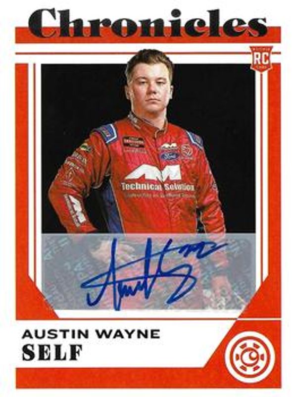 The Austin Wayne Self 2023 Chronicles NASCAR #3 Chronicles Autographs Rookie card is 1 of 71 Austin Wayne Self's card variations in the 2023 Chronicles NASCAR set being tracked by Sports Card Investor, including Base, Blue /199, Red /99, Purple /25, and Gold /10.