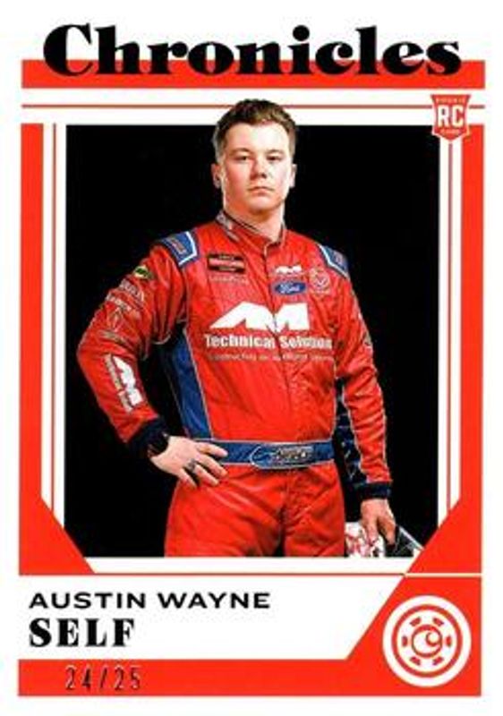 The Austin Wayne Self 2023 Chronicles NASCAR #3 Purple /25 Rookie card is 1 of 71 Austin Wayne Self's card variations in the 2023 Chronicles NASCAR set being tracked by Sports Card Investor, including Base, Blue /199, Red /99, Gold /10, and Black /1.