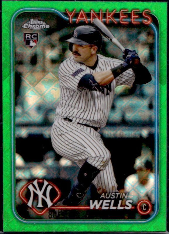 The Austin Wells 2024 Topps Chrome Logofractor Edition #281 Green /99 Rookie card is 1 of 10 Austin Wells' card variations in the 2024 Topps Chrome Logofractor Edition set being tracked by Sports Card Investor, including Base, Purple /250, Aqua /199, Blue /150, and Gold /50.