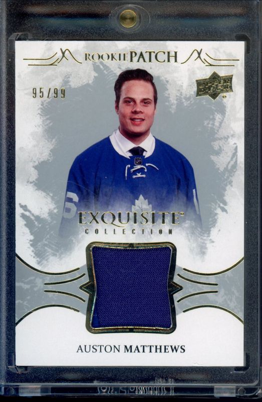 The Auston Matthews 2016 Upper Deck Black Diamond #RP-AM 2016 Upper Deck Exquisite Collection Rookie Patch /99 card is 1 of 30 Auston Matthews' card variations in the 2016 Upper Deck Black Diamond set being tracked by Sports Card Investor, including Rookie Team Logo Jumbo Manufactured Patches, Rookie Gems /399, Rookie Booklet Relics /299, 2016 Upper Deck Exquisite Collection Rookie Draft Day /199, and Silver on Black Signatures /125.